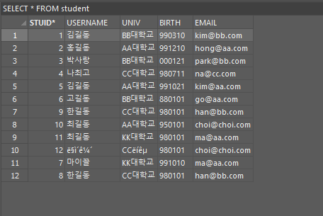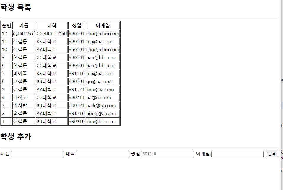 sql로 넘어오기전에 이미 웹페이지에서 인코딩이 깨져서 들어왔다는 사실을? 알 수 있음.