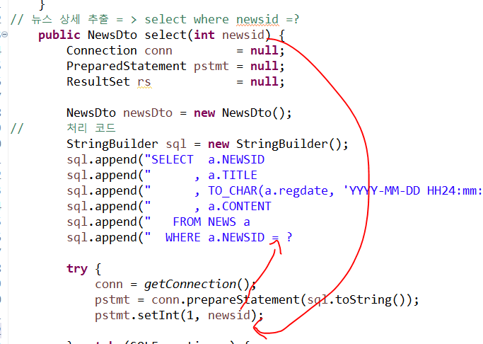 WHERE a.NEWSID =: newid -- =: 가변 데이터 입력할 때 사용 db에서 테스트할 때 사용함