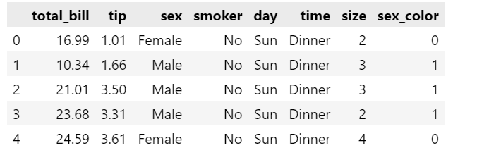 tips['sex_color'] = tips['sex'].apply(recode_sex) # Series return