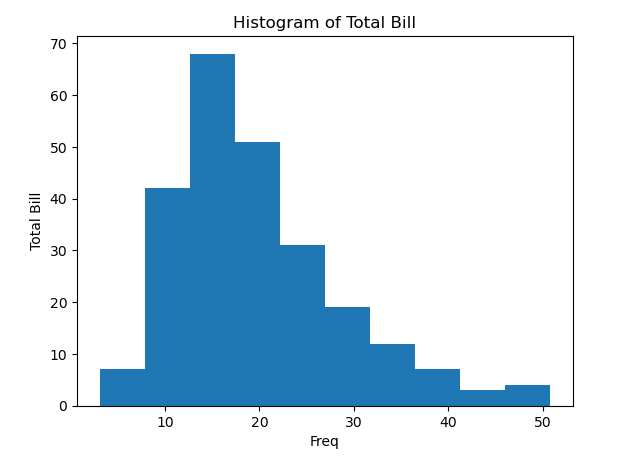 axes1.hist(tips['total_bill'], bins=10) # bins: 등분할 수 (분리할 칸수. 옆칸으로 분리해라)
