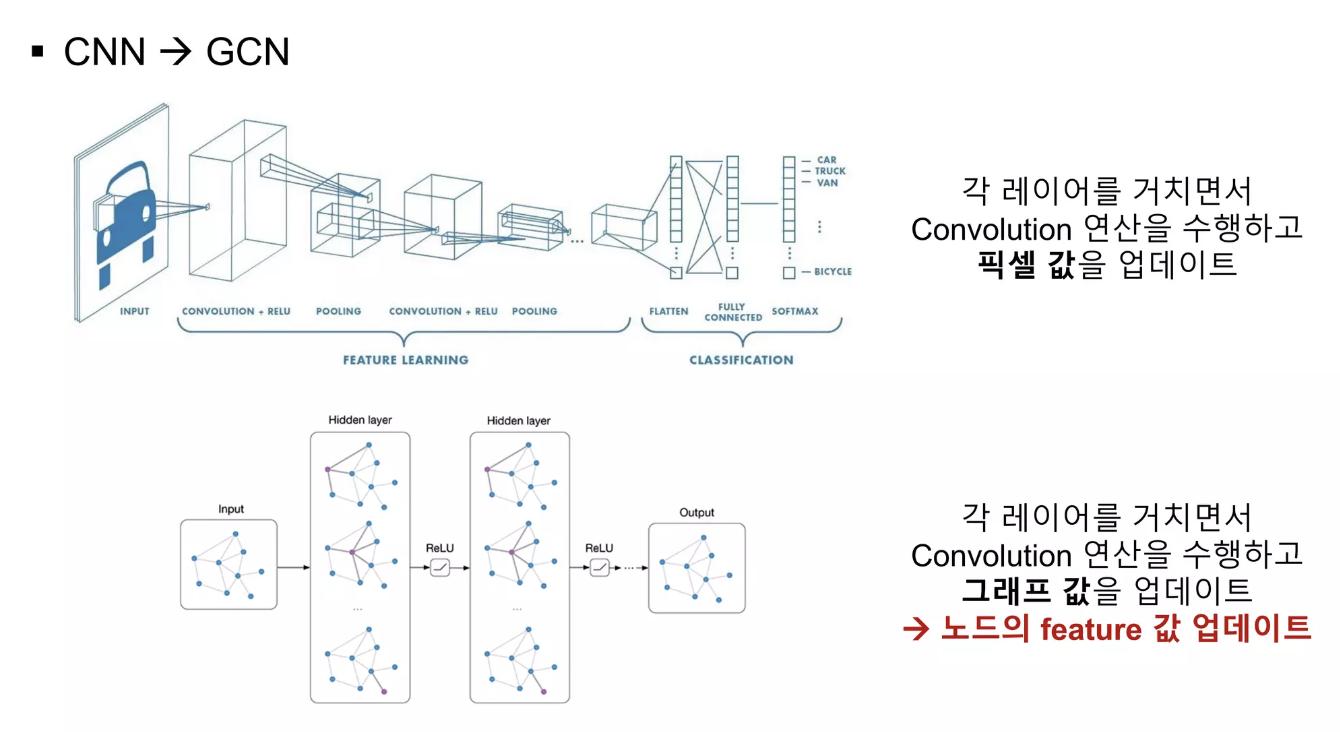 이미지에 대한 CNN연산을 그래프에 대해 적용한 것. => GCN.
