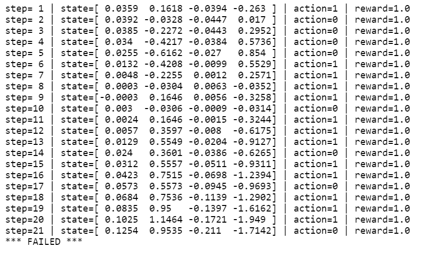 print(f'step={e:2d} | state={state} | action={a} | reward={reward}')