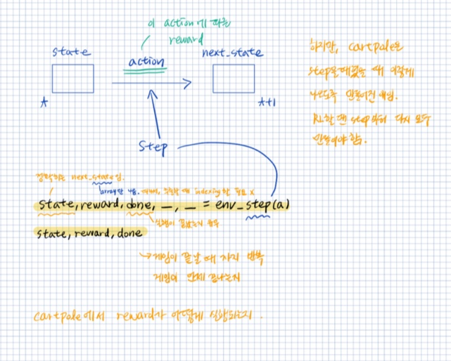 # 이건 cartpole의 구조여서 개인적으로 환경을 만들어서 강화학습을 만들어야한다.