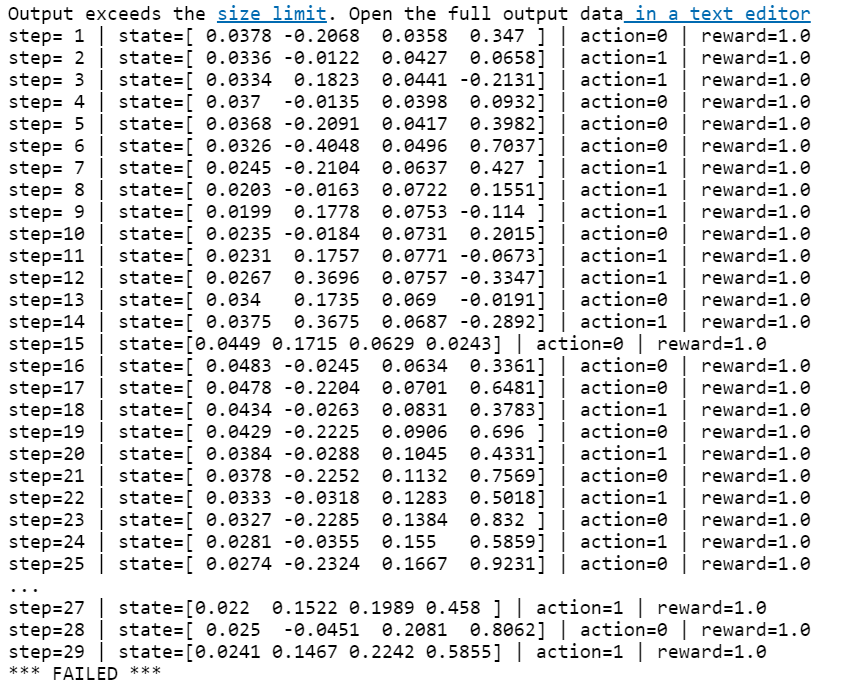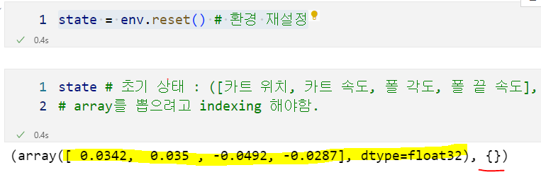 state # 초기 상태 : ([카트 위치, 카트 속도, 폴 각도, 폴 끝 속도], {}) => 전체가 tuple로 나온다