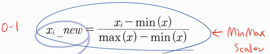 3_ Normalization : 서로 다른 피처의 크기를 통일하기 위해 크기를 변환해주는 개념. 예를 들어 feature A는 거리를 나타내는 변수로서 값이 0~100KM로 주어지고 feature B는 금액을 나타내는 속석으로 값이 0 ~ 100,000,000,000원으로 주어진다면 이 변수를 모두 동일한 크기 단위로 비교하기 위해 값을 모두 최소 0 ~ 최대 1의 값으로 변환하는 것. 즉, 개별데이터의 크기를 모두 똑같은 단위로 변경하는 것이다. 새로운 데이터 Xi_new는 원래 값에서 feature x의 최솟값을 뺀 값을 feature x의 최댓값과 최솟값의 차이로 나눈 값으로 변환 할 수 있다.