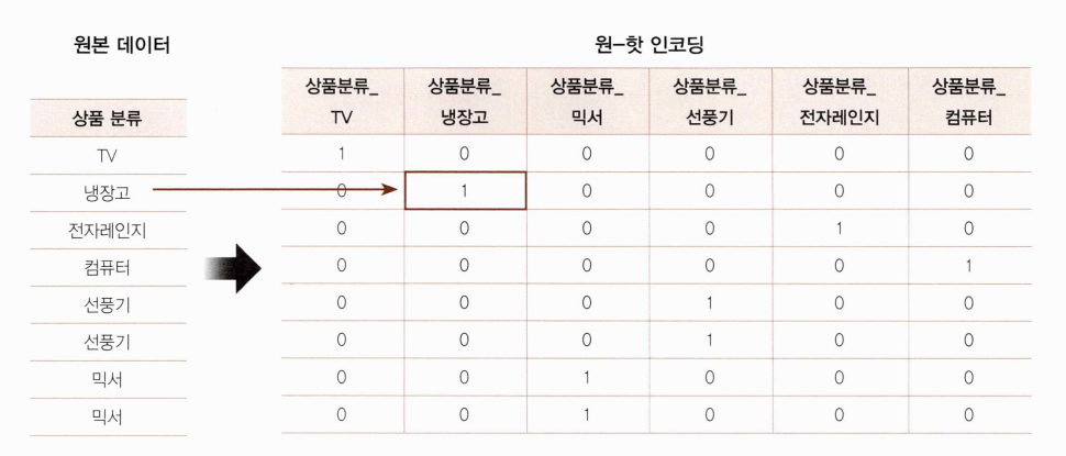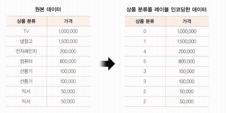 ex) 상품 데이터의 상품 구분이 TV, Refrigerator, Microwave, Computer, Fan, Mixer 값으로 되어 있다면 TV:1, Refrigerator:2, Microwave:3, Computer:4, Fan:5, Mixer:6 과 같은 숫자형 값으로 변환 하는 것.