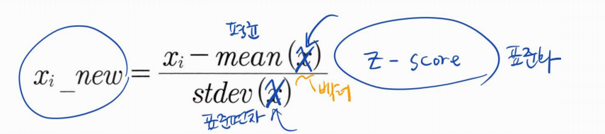 2_ Standardization : 데이터의 피처 각각이 평균이 0이고 분산이 1인 가우시안 정규분포를 가진 값으로 변환하는 것을 의미. 표준화를 통해 변환될 피처 x의 새로운 i번째 데이터를 Xi_new라고 한다면 이 값은 원래 값에서 피처 x의 평균을 뺀 값을 피처 x의 표준편차로 나눈 값으로 계산 할 수 있다.