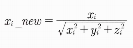 사이킷런의 전처리에서 제공하는 Normalizer 모듈과 일반적인 정규화는 약간의 차이가 있다. 사이킷런의 Normalizer 모듈은 선형대수에서의 정규화 개념이 적용되었으며 개별 벡터의 크기를 맞추기 위해 변환하는 것을 의미합니다. 즉, 개별 벡터를 모든 피처 벡터의 크기로 나눠 줍니다. 3개의 피처 x,y,z가 있다고 하면 새로운 데이터 Xi_new는 원래 값에서 3개의 피처의 i 번째 피처 값에 해당하는 크기를 합한 값으로 나눠 줍니다.