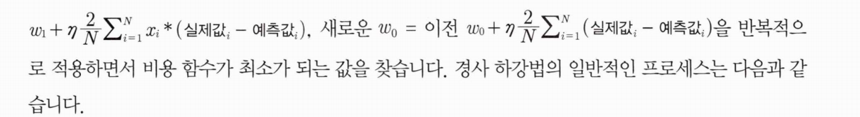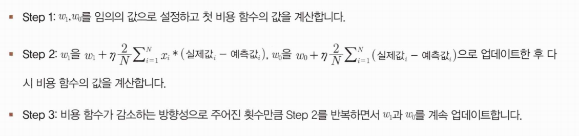 gradient_descent_steps를 호출해 w1, w0을 구하고 최종적으로 예측값과 실제값의 RSS차이를 계산하는 get_cost()함수를 생성하고 이를 이용해 경사 하강법의 예측 오류를 계산