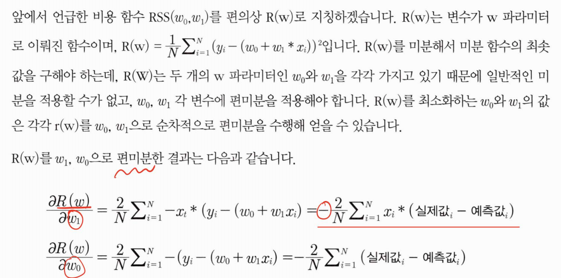 회귀에서 이 RSS는 비용(cost)이며, w변수(회귀 계수)로 구성되는 RSS를 비용함수라고 한다. 머신러닝 회귀 알고리즘은 데이터를 계속 학습하면서 이 비용 함수가 반환하는 값 (오류값)을 지속해서 감소시키고 최종저긍로는 더 이상 감소하지 않는 최소의 오류값을 구하는 것이다. 비용 함수를 손실함수(loss function = costfunction) 라고도 한다. (최소화된 오차를 구하는 모델 => optimizer)