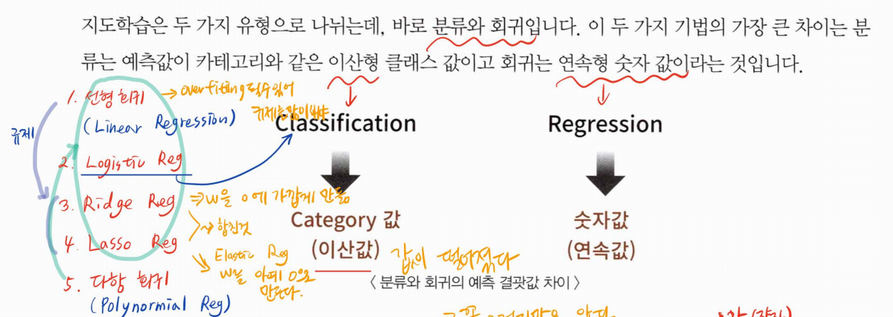 지도학습은 2가지 유형으로 나뉘는데 그것은 분류와 회귀이다. 이 2가지 기번의 가장 큰 차이는 분류는 예측값이 카테고리와 같은 이산형 클래스 값이고, 회귀는 연속형 숫자값이라는 것이다.