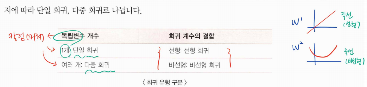 회귀는 회귀 계수의 선형/비선형 여부, 독립변수의 개수, 종속변수의 개수에 따라 여러 가지 유형으로 나눌 수 있다. 회귀에서 가장 중요한 것은 회귀 계수(w: weight)이다. 이 회귀 계수가 선형인지 아닌지에 따라 선형 회귀와 비선형 회귀로 나눌 수 있다. 그리고 독립변수의 개수가 한 개인지 여러 개인지에 따라 단일 회귀, 다중 회귀로 나뉜다.