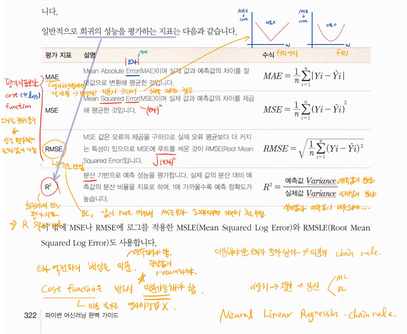 회귀의 평가를 위한 지표는 실제 값과 회귀 예측값을 기반으로 한 지표가 중심이다. 실제값과 예측값의 차이를 그냥 더하면 +와 -가 섞여서 오류가 상쇄된다. 이 때문에 오류의 절댓값 평균이나 제곱, 또는 제곱한 뒤 다시 루트를 씌운 평균값을 구한다.